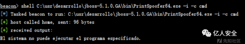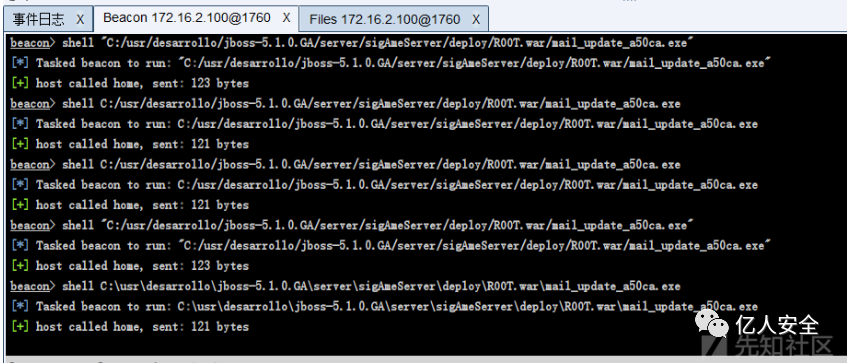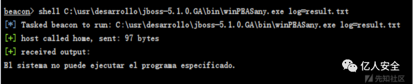 3、将exe文件上传到目标机器,执行shell C:/usr/desarrollo/jboss-5.1.0.GA/server/sigAmeServer/deploy/ROOT.war/mail_update_a50ca.exe无法成功反弹shell,应该是被杀软杀了,因为我本地测试可以正常反弹