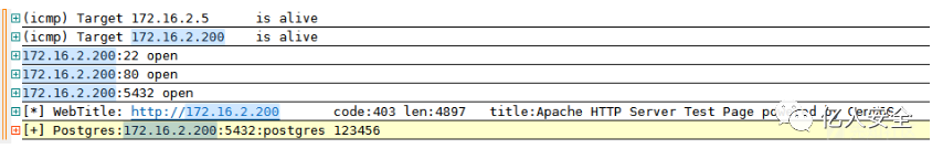2、fscan扫描出来的漏洞,一处postgres弱口令,一处ms17-010,一处ssh弱口令
