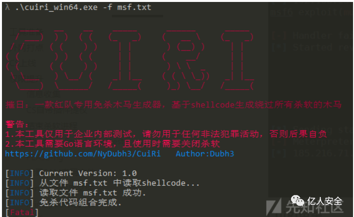 1、因为有杀软,我们要考虑绕过,直接上传CS木马肯定是不行的,本次绕过的是潮汐shellcode免杀,因为很多github上利用python打包的exe文件太大,上传很慢,而潮汐shellcode免杀文件较小,上传快。