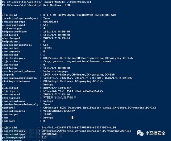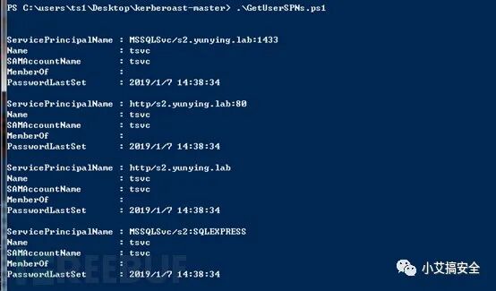 一、在域内主机 s1 中通过 Kerberoast 中的 GetUserSPNs.ps1 进行 SPN 扫描。