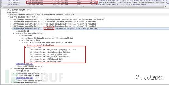 setspn -T yunying.lab -q */*命令查询域内 SPN 时,通过抓包可以看到正是通过 LDAP 协议向域控中安装的 LDAP 服务查询了 SPN 的内容。