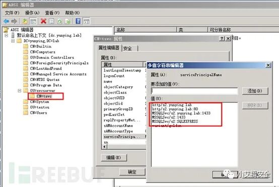 比如在我们是实验环境域 YUNYING.LAB 中,存在名为 svcserver 的一个 OU(OrganizationUnit,可以理解为一个部门,如开发部、财务部等等),其中包含了 tsvc 这个用户,从用户属性中可以看到 tsvc 注册过的 SPN 内容。