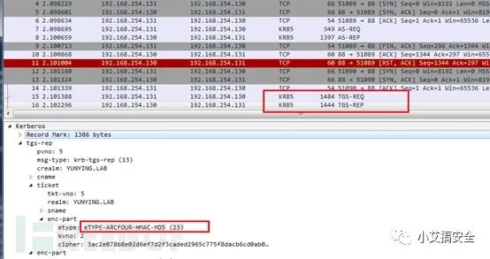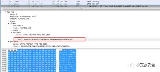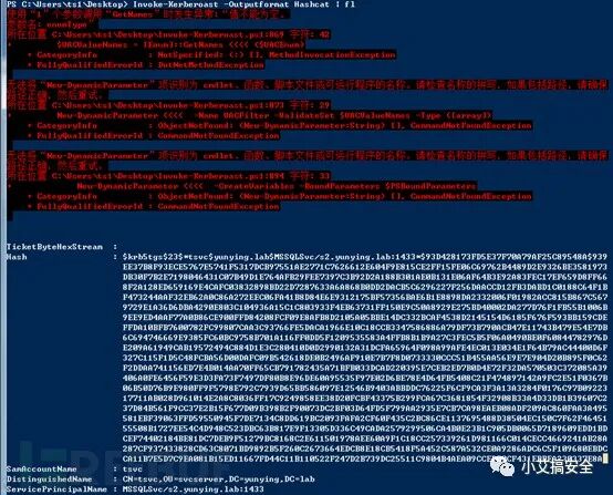 这个脚本申请访问的是 MSSQLSvc/s2.yunying.lab:1433 这个 SPN。查看数据包可以看到 Invoke-Kerberoast 输出的 Hash 值就是 TGS-REP 中返回的票据内容,然后拼接成了 Hashcat 可以直接爆破的格式(以$krb5tgs$23*开头的)。