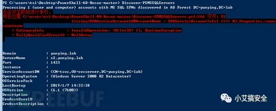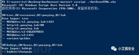 MSSQLSvc/ s2.yunying.lab:1433在了解了 Kerberos 和 SPN 之后我们可以通过 SPN 来获取我们想要的信息,比如想知道域内哪些主机安装了什么服务,我们就不需要再进行批量的网络端口扫描。在一个大型域中通常会有不止一个的服务注册 SPN,所以可以通过「SPN 扫描」的方式来查看域内的服务。相对于通常的网络端口扫描的优点是不用直接和服务主机建立连接,且隐蔽性更高。