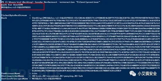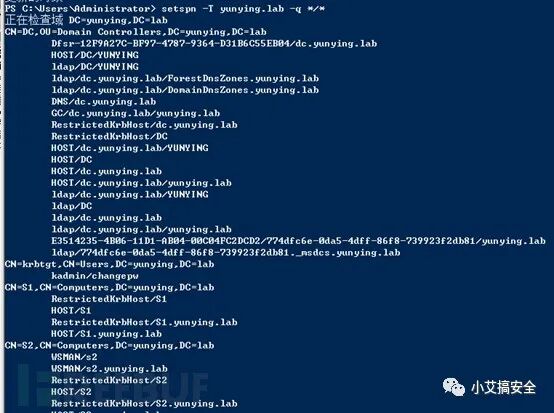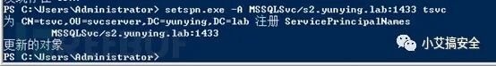Setspn-A MSSQLSvc/s2.yunying.lab:1433 tsvc注册成功之后可以通过下面两个命令来查看已经注册的 SPN。