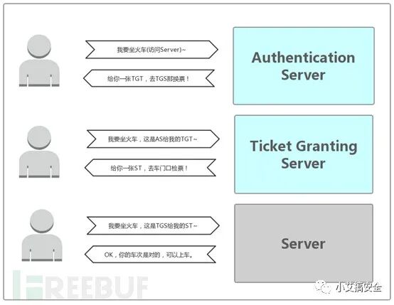 如果把 Kerberos 中的票据类比为一张火车票,那么 Client 端就是乘客,Server 端就是火车,而 KDC 就是就是车站的认证系统。如果 Client 端的票据是合法的(由你本人身份证购买并由你本人持有)同时有访问 Server 端服务的权限(车票对应车次正确)那么你才能上车。当然和火车票不一样的是 Kerberos 中有存在两张票,而火车票从头到尾只有一张。