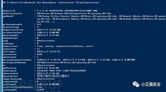 Get-DomainUser 输出的值(-erroraction"Silentlycontinue"消除 powershell 中的红字告警,也可以直接去掉):