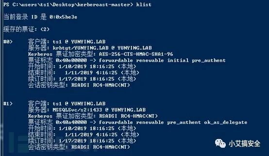 三、Kerberos 协议中请求的票据会保存在内存中,可以通过 klist 命令查看当前会话存储的 kerberos 票据。