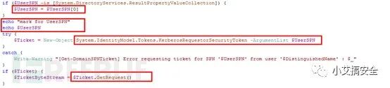 函数 Get-DomainSPNTicket 在接收到 Get-DomainUser 的输出结果后提取 SPN(ServicePrincipalName)字段的值,然后取其中的第一个赋值给变量 UserSPN。我们在代码中添加 echo 语句,然后再执行可以看到本次的结果选取了 SPN 列表中的第一条 MSSQLSvc/s2:SQLEXPRESS。