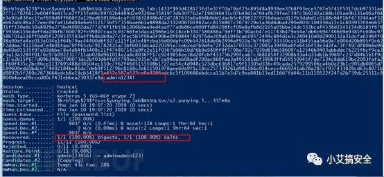 PSC:> hashcat64.exe –m 13100 test1.txt password.list --force可以看到这里已经离线破解成功,输出了 s2 的密码 admin1234!。在这里–m 表示选择不同的加密类型,其中 13100 对应的是 Kerberos 5 TGS-REP 类型的密文。