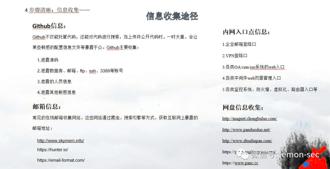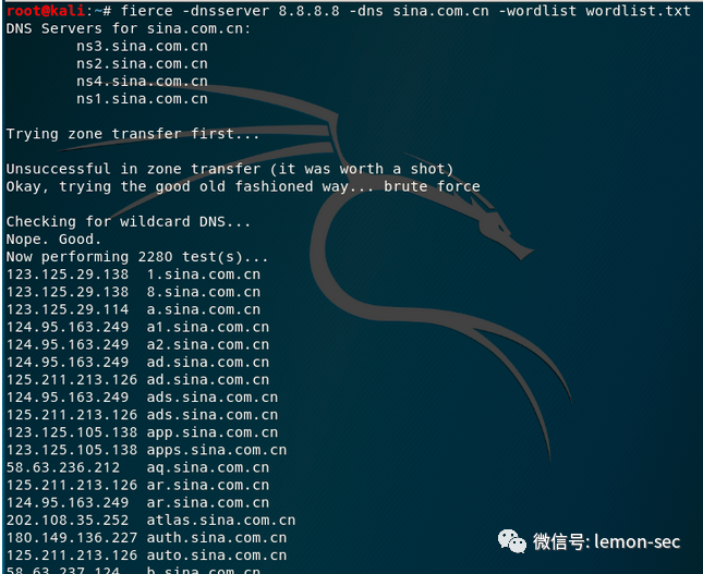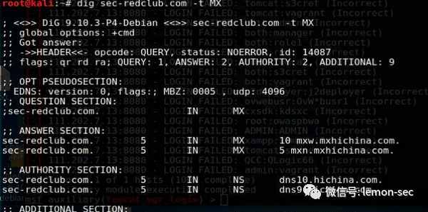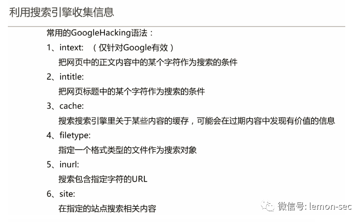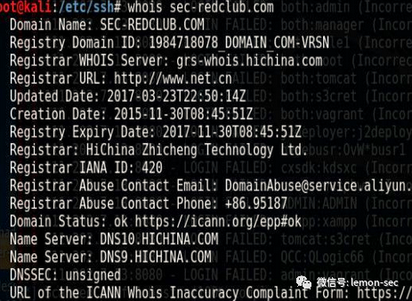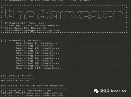 fierce工具,可以进行域名列表查询:fierce -dns domainNametheHarvester是一个社会工程学工具,它通过搜索引擎、PGP服务器以及SHODAN数据库收集用户的email,子域名,主机,雇员名,开放端口和banner信息。theHarvester -d sec-redclub.com -l 100 -b baidu