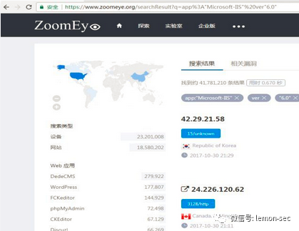 例1:搜索使用iis6.0主机:app:"Microsoft-IIS" ver"6.0",可以看到0.6秒搜索到41,781,210左右的使用iis6.0的主机。