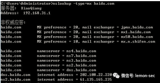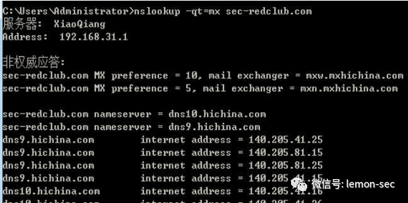-t 选项,用来设置查询类型,默认情况下是A,也可以设置MX等类型,来一个例子: