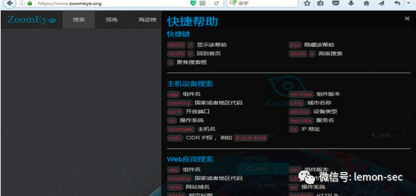 ZoomEye支持公网设备指纹检索和 Web 指纹检索Esc: 隐藏快捷帮助