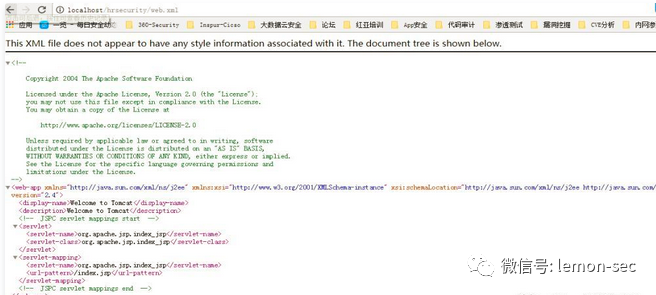 http://localhost/,进入此页面,证明我们tomcat已经启动,我们查看一下web.xml目录在哪里,你可以练习此靶场,靶场在后续会进行讲解。这里我们只讲解此web.xml信息泄露漏洞。如果让用户设置权限不严格,造成一些目录列出,结果是非常严重,我们通过访问web.xml文件,可以查看一些敏感信息,如下图利用工具扫描,我们得知此目录下面有一些敏感文件,我们尝试去访问