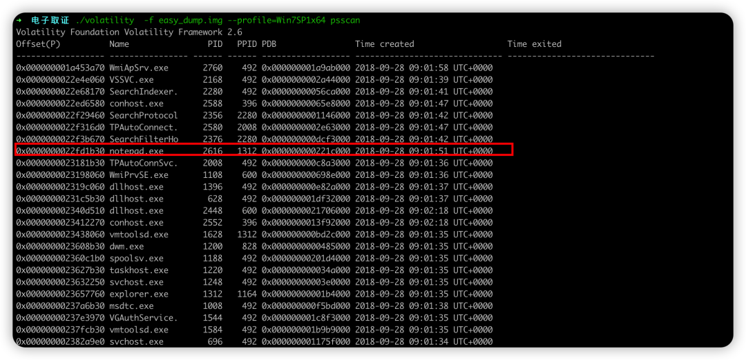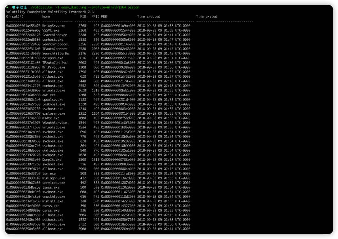 volatility -f easy_dump.img --profile=Win7SP1x64 psscan