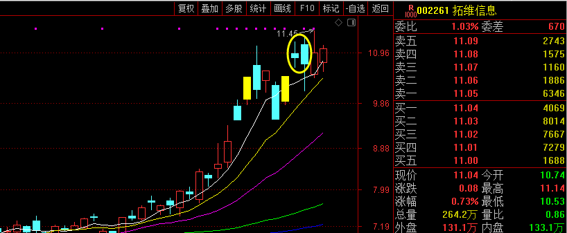 比如上图圆圈标记的部分,当时已经出现横盘滞涨,还在里面的不就是博弈继续向上变盘么,但现在不确定性增加,那就只做连阳放弃震荡,可以先走,或许就避开调整了。