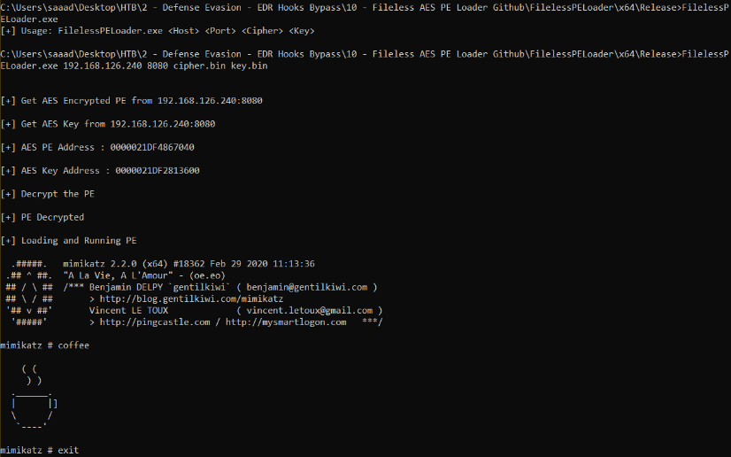 将PE文件进行AES加密,然后从远程程序中提取加载内存中实现免杀。