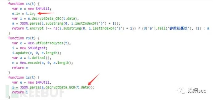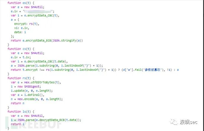 在app.js中搜索关键词sm3,sm4,encryptData等关键词,找到加解密方法,以下os和rs方法为请求包加密方法,而cs和ls则为返回包解密函数。由于从数据包中看到的请求体数据和返回包数据的格式分别为字符和json数据。os方法加密后的数据为json格式,因此请求包加密方式为先使用SM4的CBC模式加密,然后使用ECB模式进行加密,最后使用SM3对json数据加密。![Js逆向实战案例插图3]()