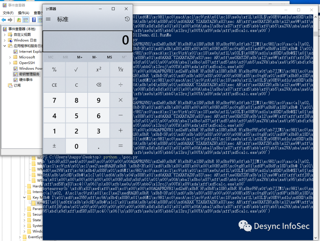 用Visual Studio编译PoC代码后放在环境中执行,从“隐藏”在事件日志Key Management Services的第一条日志中提取二进制载荷数据并且成功执行。过程中defender并未对其进行告警。