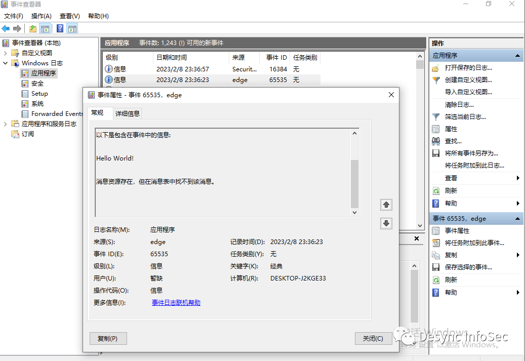 Write-EventLog -LogName Application -Source edge -EventID 65535 -EntryType Information -Category 0 -Message "Hello World!"在事件查看器中,可以看到事件ID为65535的日志成功创建在应用程序日志中,消息为Hello World!