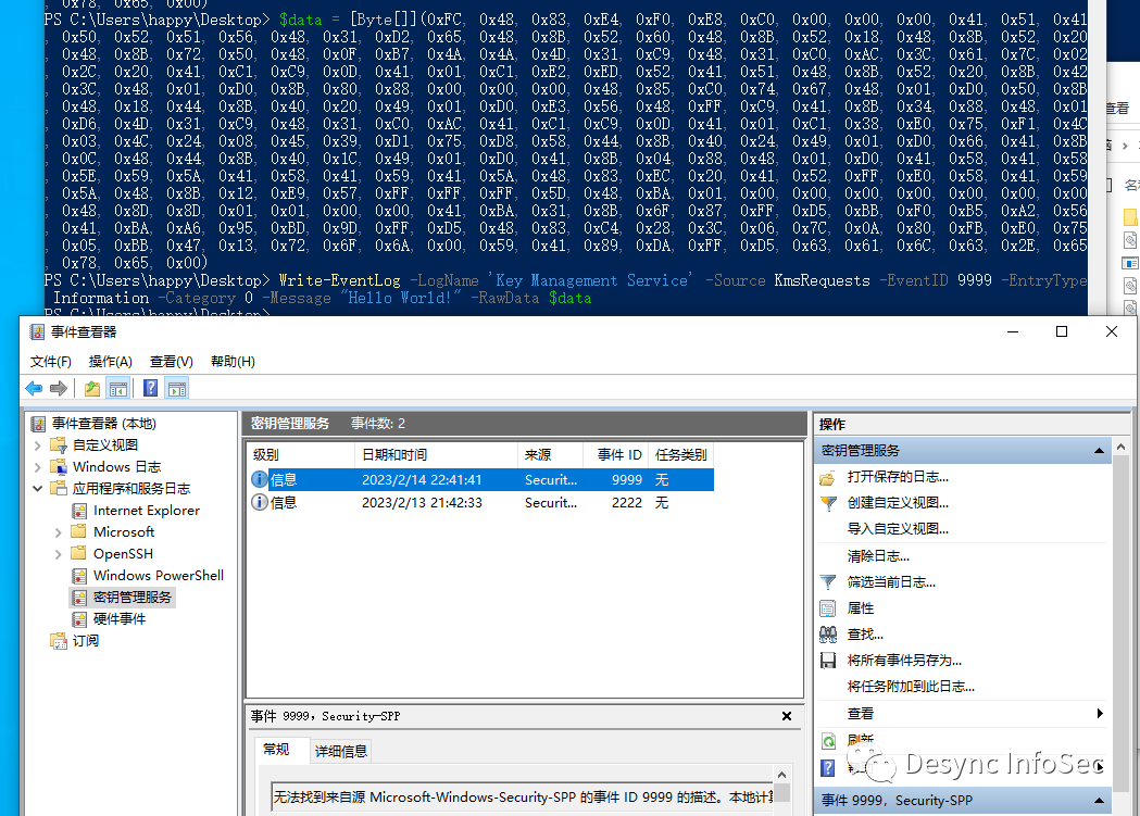 Write-EventLog -LogName 'Key Management Service' -Source KmsRequests -EventID 9999 -EntryType Information -Category 0 -Message "Hello World!" -RawData $data执行后,Payload已成功存储到事件日志当中。于事件日志的详细信息就能查看到。