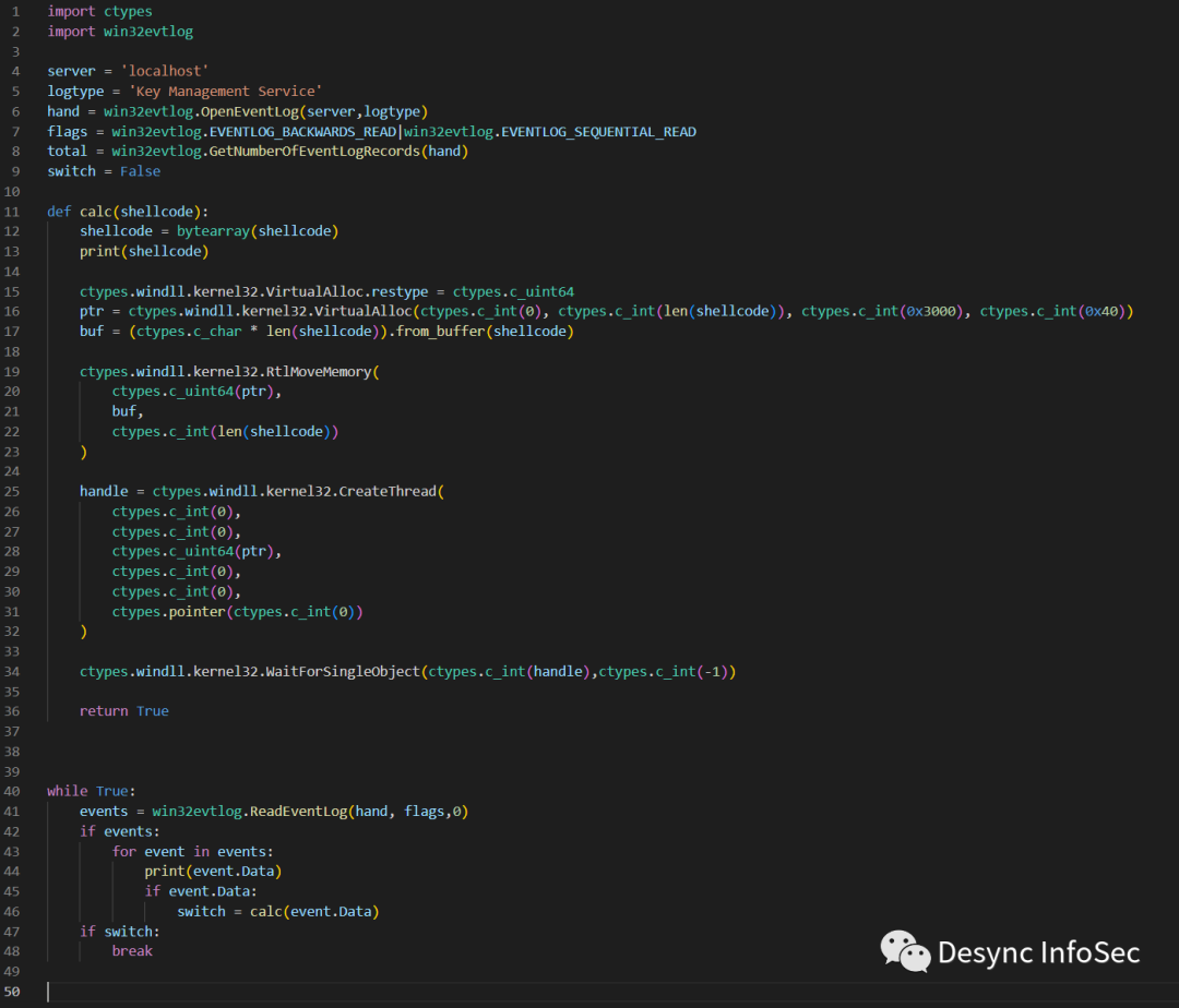 另外使用Python的win32evtlog实现读取事件日志内容,然后也用非常常见的shellcode注入技术执行该载荷。