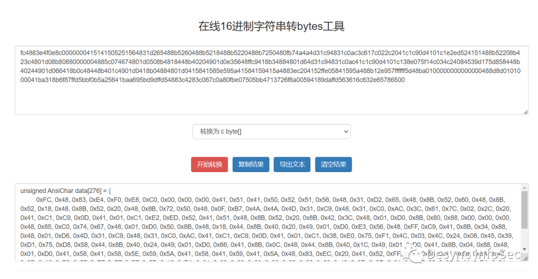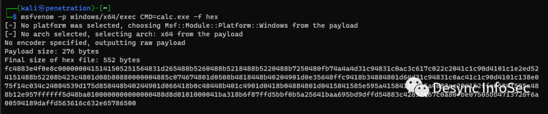 首先,使用msfvenom生成弹计算器 payload。输出格式为十六进制字符串