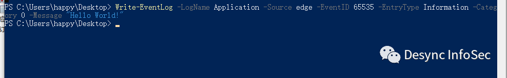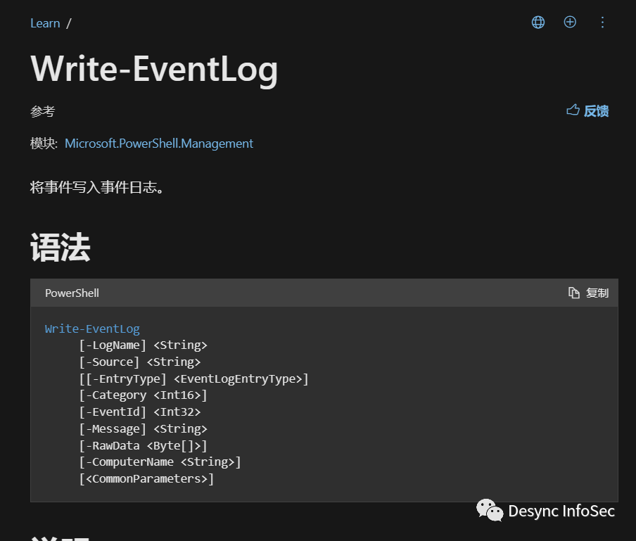 我们可以使用PowerShell操作Windows事件日志,其中Write-EventLog命令可以将事件写入事件日志,参考微软官方文档,其中参数对应上面介绍的字段: