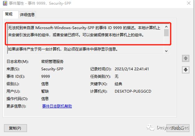 在HKEY_LOCAL_MACHINE\SYSTEM\CurrentControlSet\Services\EventLog\对应的日志名称下的条目中,存在一个EventMessageFile属性。如果在注入载荷的时候,事件ID不存在于该属性指定的源关联的事件消息文件中,则会出现下图这个日志消息:
