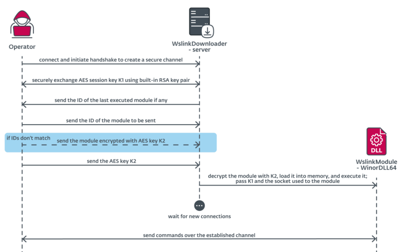 近日,ESET的研究人员披露了具有朝鲜背景的APT组织,Lazarus Group可能使用了与Wslink恶意软件下载程序相关的WinorDLL64新后门窃取敏感信息。Wslink于2021年首次被Welivesecurity发现,是Windows二进制文件的加载器,并且当时任何证据表明Wslink来自已知威胁组织。此后,ESET披露了该下载程序的一个有效载荷:WinorDLL64后门。WinorDLL64是一个功能齐全的植入程序,可以泄露、覆盖和删除文件,执行PowerShell命令,并获取大量与系统相关的信息。经ESET研究人员分析发现,WinorDLL64在开发环境、行为特征和代码特征方面与多个Lazarus的样本有所重叠,由此推测其可能是该APT组织武器库中的一部分。WinorDLL64后门与Wslink的通信方式如下图所示。
