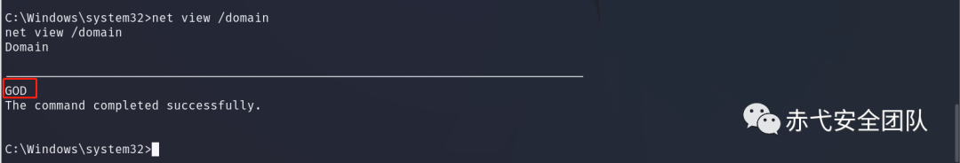 2)上面发现了DNS服务器名为god.org,当前登陆域为GOD,接下来可执行net view /domain查看有几个域(域内可能存在多个域环境)。