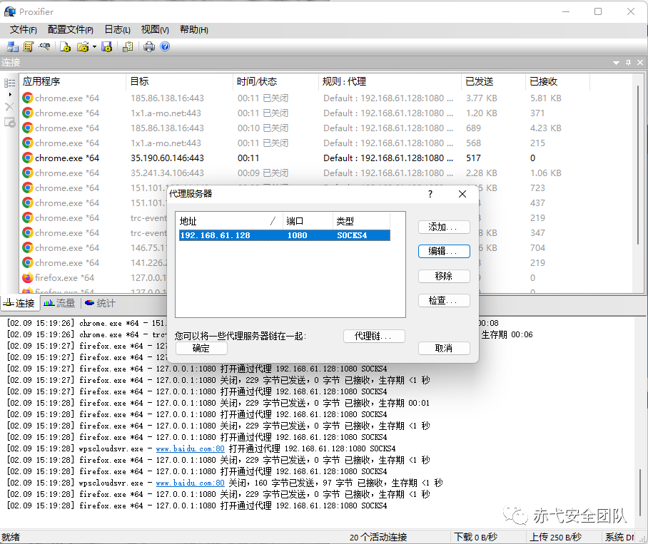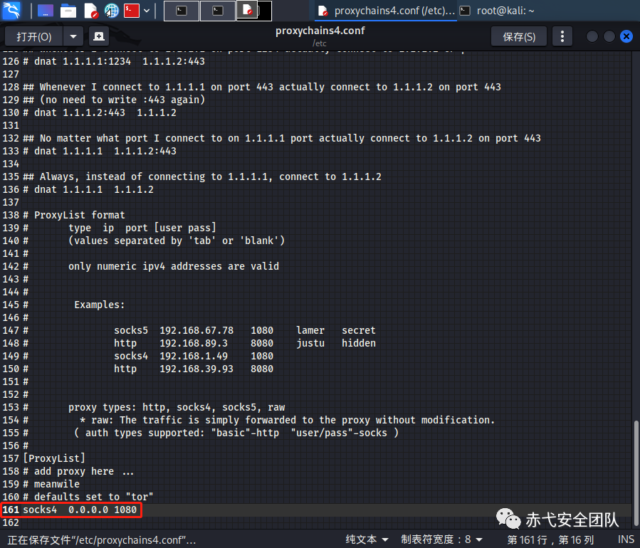 3)修改一下/etc/proxychain4.conf,这里注意我们使用的是socks4。