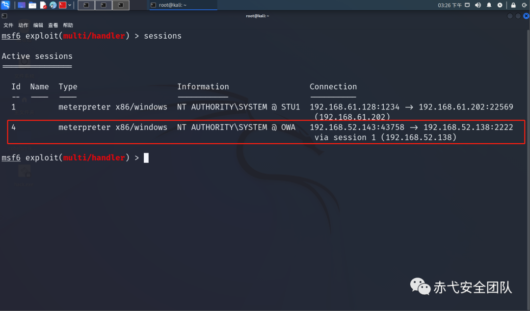 6)至此内网的信息收集已经收集完毕,已经明确了域控主机192.168.52.138,同时还存在另一台域成员192.168.52.141,接下来的目标就是横向移动拿下域控。