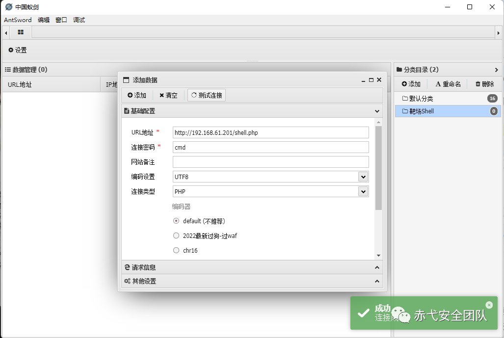 7)接下来,我们使用蚁剑链接一下我们的shell。