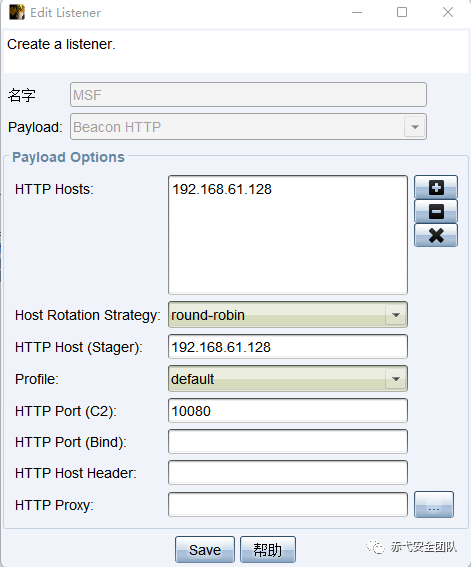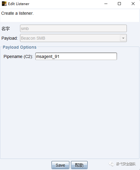 2)新建一个监听器,payload选择Beacon SMB,名字随便。