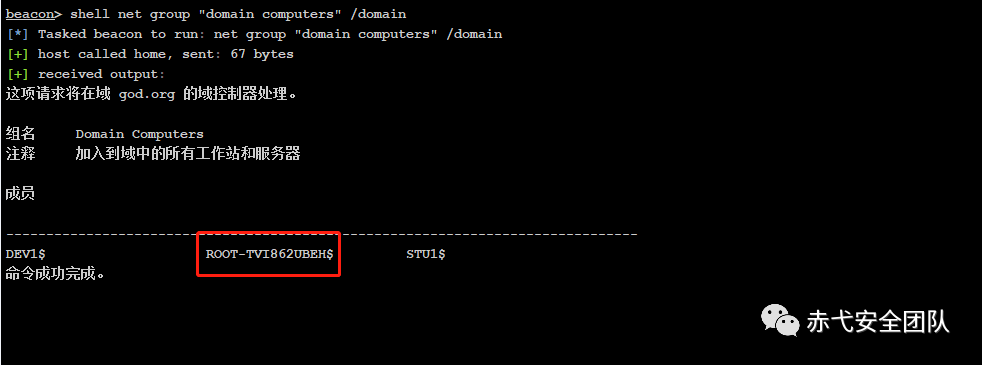 5)局域网扫描出来除了域控主机之外还有另一台主机(名称为ROOT-TVI862UBEH),最后确认以下该主机是否也是存在域中,执行命令net group "domain computers" /domain查看域中的其他主机发现包含ROOT-TVI862UBEH,故域内还包含另一个域成员192.168.52.141。
