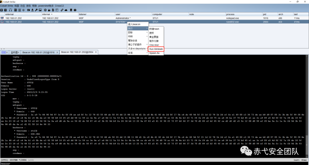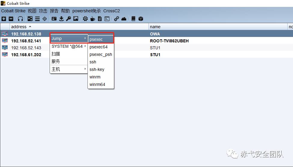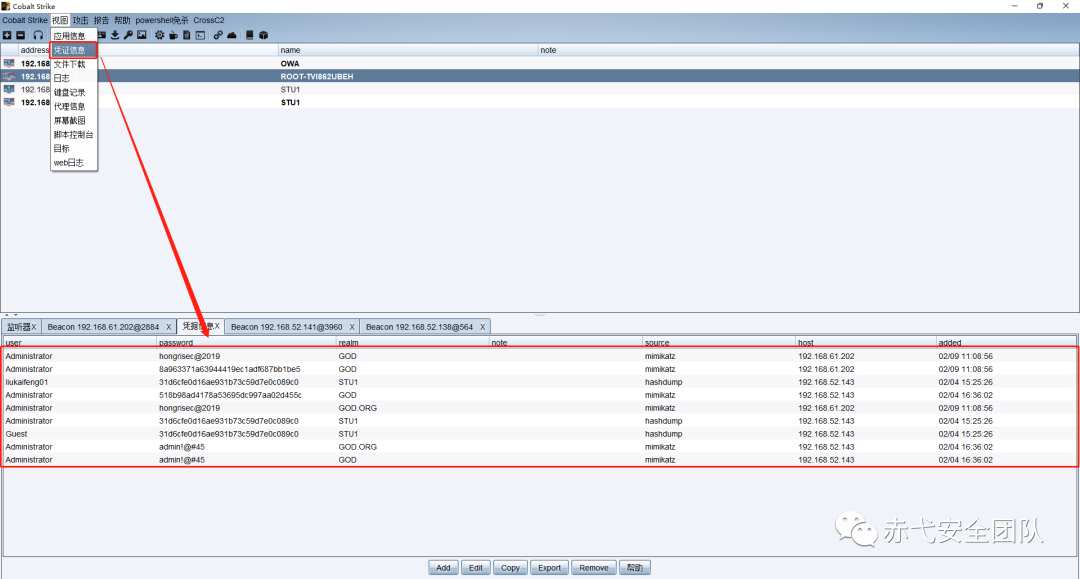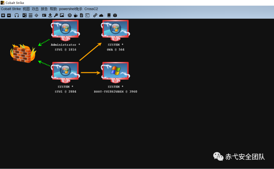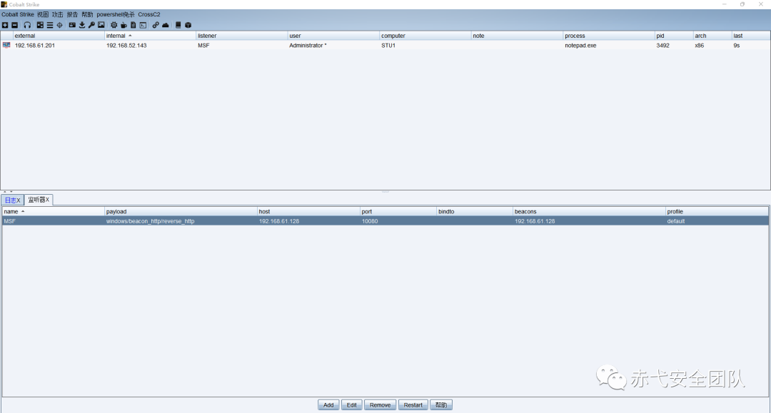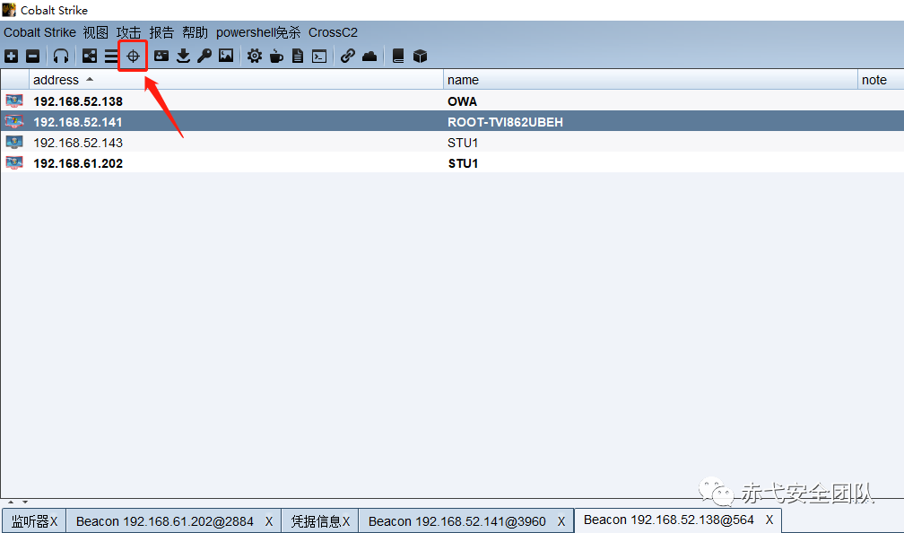 1)我们已经拿下了Windows7主机,抓取到了它的hash和密码,而我们前面信息收集到另外两台机器开启了445端口,在目标不出网的情况下,可以使用smb beacon使目标主机上线。
