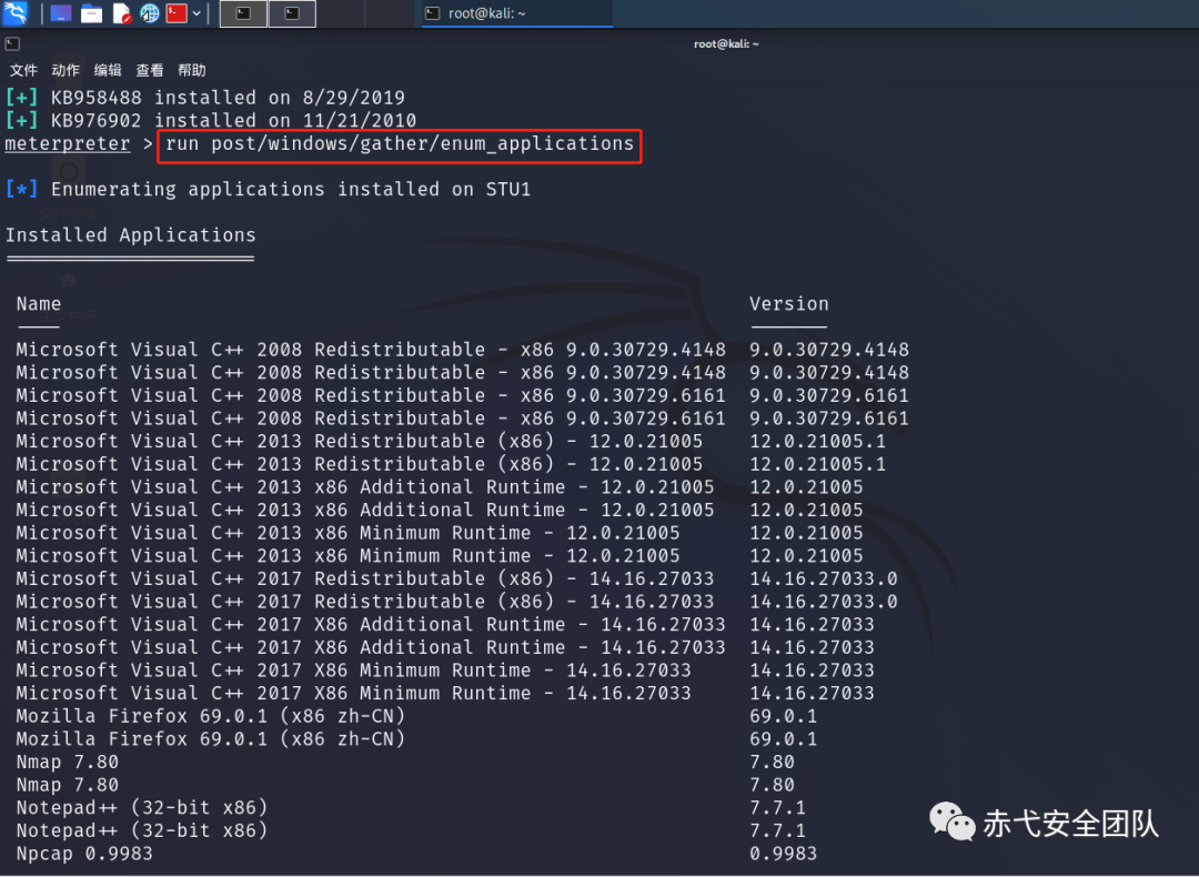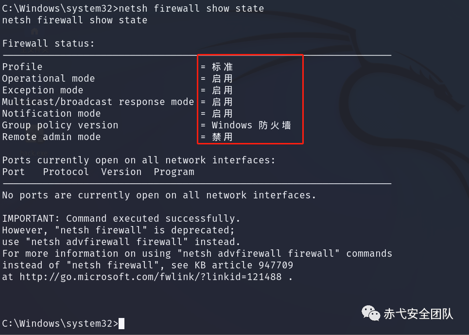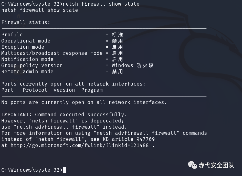 run post/windows/gather/enum_applications9)进入shell查看防火墙状态。