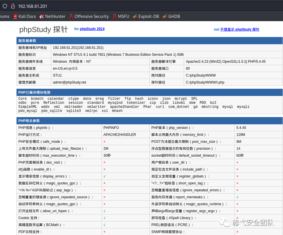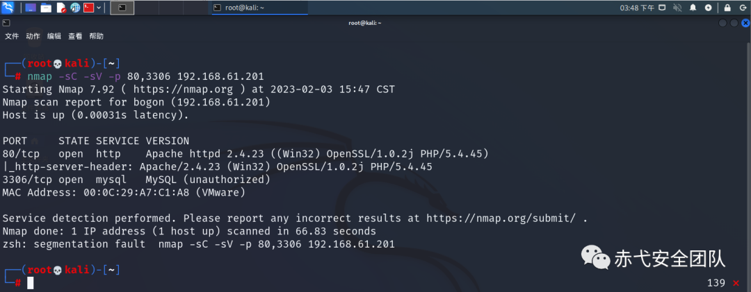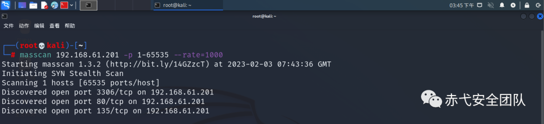 masscan 192.168.61.201 -p 1-65535 --rate=1000重点关注80,3306端口。