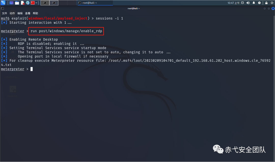 run getgui -erun post/windows/manage/enable_rdp #两个都可以在shell下使用以下命令也可REG ADD HKLM\SYSTEM\CurrentControlSet\Control\Terminal" "Server /v fDenyTSConnections /t REG_DWORD /d 00000000 /f # 允许 3389 端口放行netsh advfirewall firewall add rule name="Remote Desktop" protocol=TCP dir=in localport=3389 action=allow # 允许 3389 端口放行wmic RDTOGGLE WHERE ServerName='%COMPUTERNAME%' call SetAllowTSConnections 1 #wmic 放行3389端口