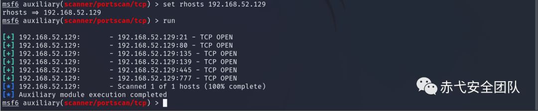 use auxiliary/scanner/portscan/tcpset RHOSTS 192.168.52.129