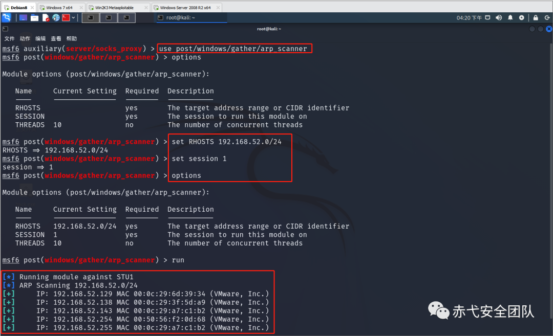 use post/windows/gather/arp_scannerset RHOSTS 192.168.52.0/24set SESSION 1