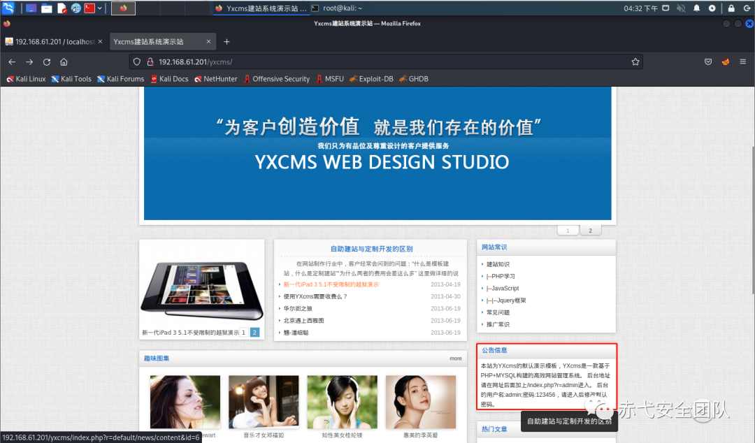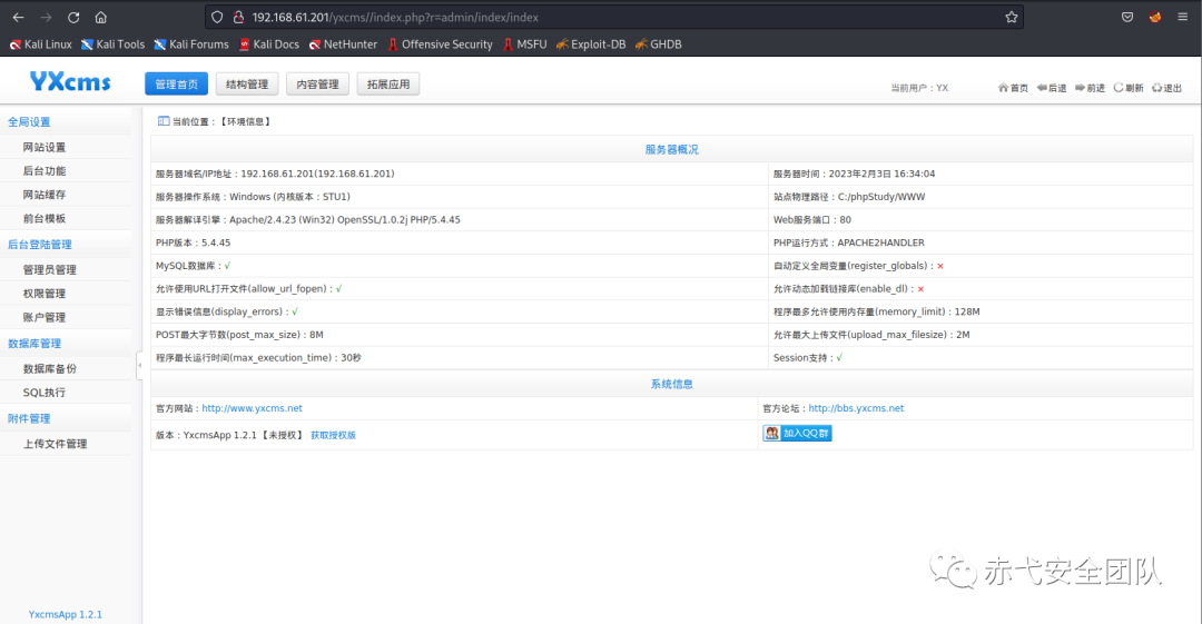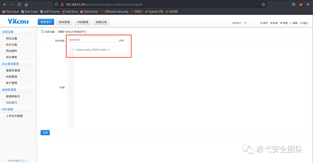 http://192.168.61.201/yxcms/protected/apps/default/view/default/webshell.php