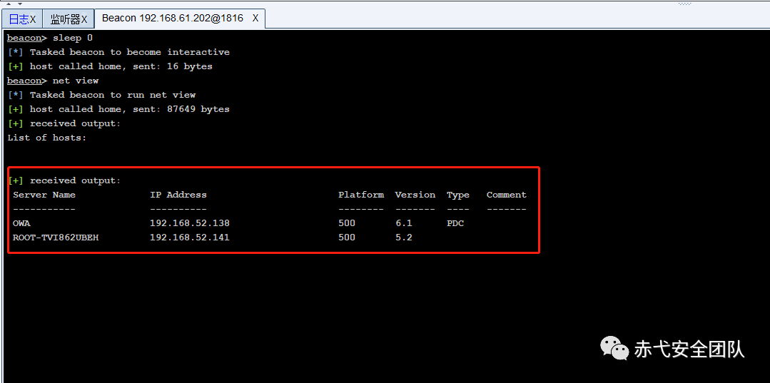 4)已经确认域控主机的名称为OWA,继续执行命令net view查看局域网其他主机信息(主机名称,IP地址),可得知域控主机的IP192.168.61.138。这条命令在CS中执行。