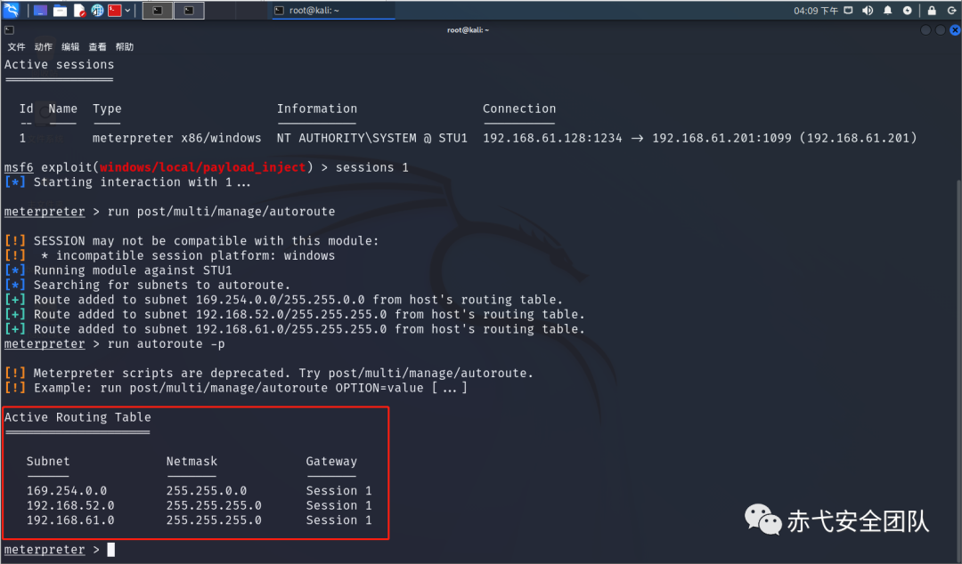 run post/multi/manage/autoroute //配置静态路由run autoroute -p //查看路由